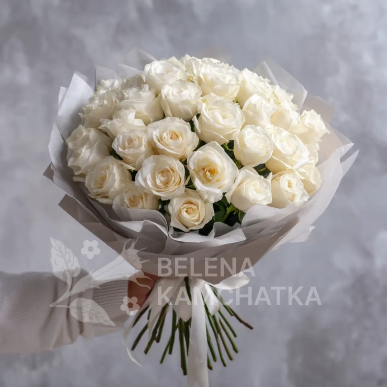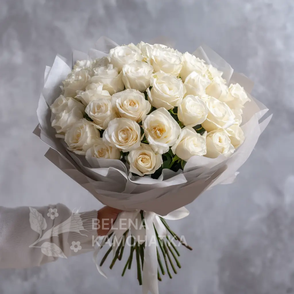 Белые розы в приглушённой палитре и упаковке цвета тумана — для создания атмосферы загадочности и элегантности. Такой букет говорит о глубине и осознанности чувств.