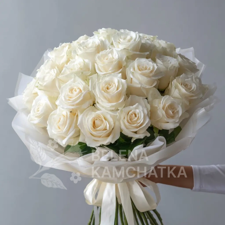 Нежный и лёгкий букет из белых роз, словно облака с каплей утреннего аромата. Прекрасен как подарок для романтических случаев или в качестве комплимента без повода. Сочетает свежесть и деликатность.
