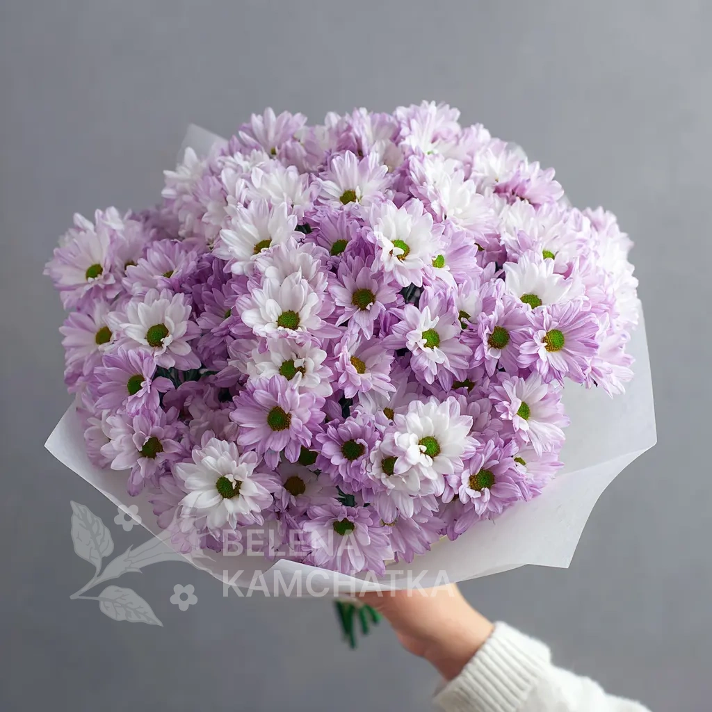 Цветовая нежность делает букет выразительным, а хризантемы обеспечивают стойкость и эффектность на несколько дней.