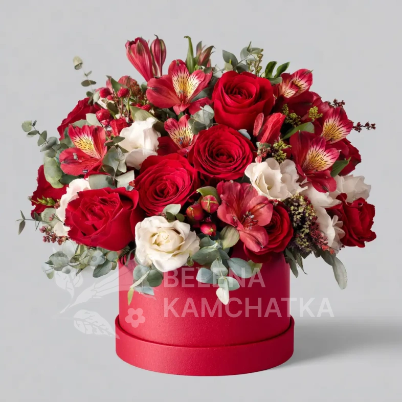Красные розы, белая альстромерия и зелень эвкалипта — идеальный букет для романтического настроения и особых моментов.