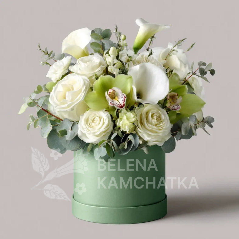 Зеленые орхидеи, каллы и эвкалипт — элегантная композиция для ценителей красоты и изящества.