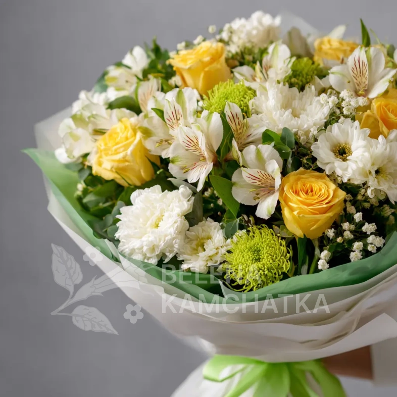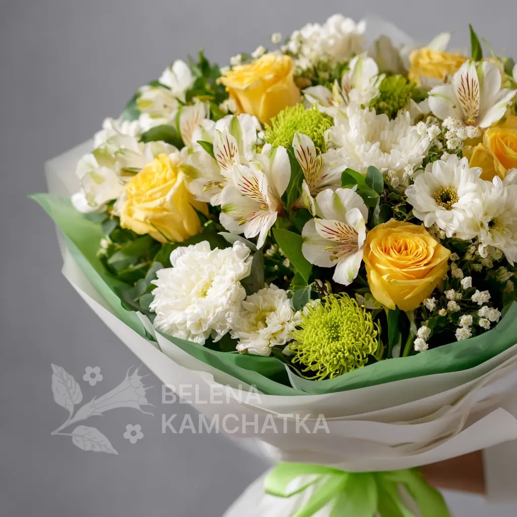 Композиция, как летняя песня — наполнена мягкими красками, теплом и светом. Альстромерии добавляют воздушности и утончённости. Универсальное решение для поздравления женщины или девушки.