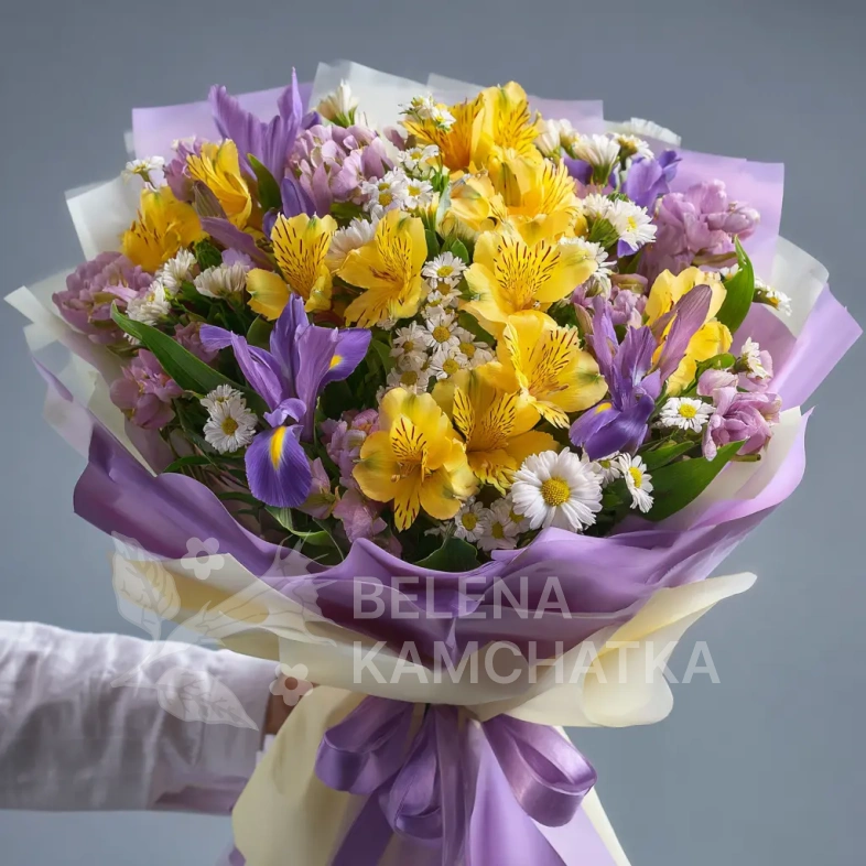 Композиция в жёлто-фиолетовой гамме — как всплеск света в пасмурный день. Альстромерии создают ощущение тепла и оптимизма. Прекрасно подойдёт для поднятия настроения или неожиданного подарка.