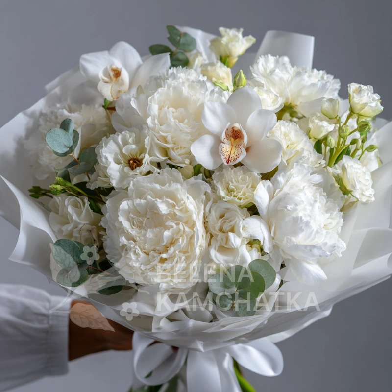 Чистый, белоснежный букет с пионами. Минимализм и утончённость в одной композиции. Подходит для свадеб, фотосессий и подарков «без повода».