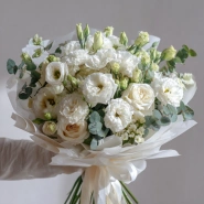 Полупрозрачная цветочная история, созданная из воздушных эустом. Букет в бежевых и молочных оттенках — выбор для свадеб, крестин или символа чистоты и лёгкости.