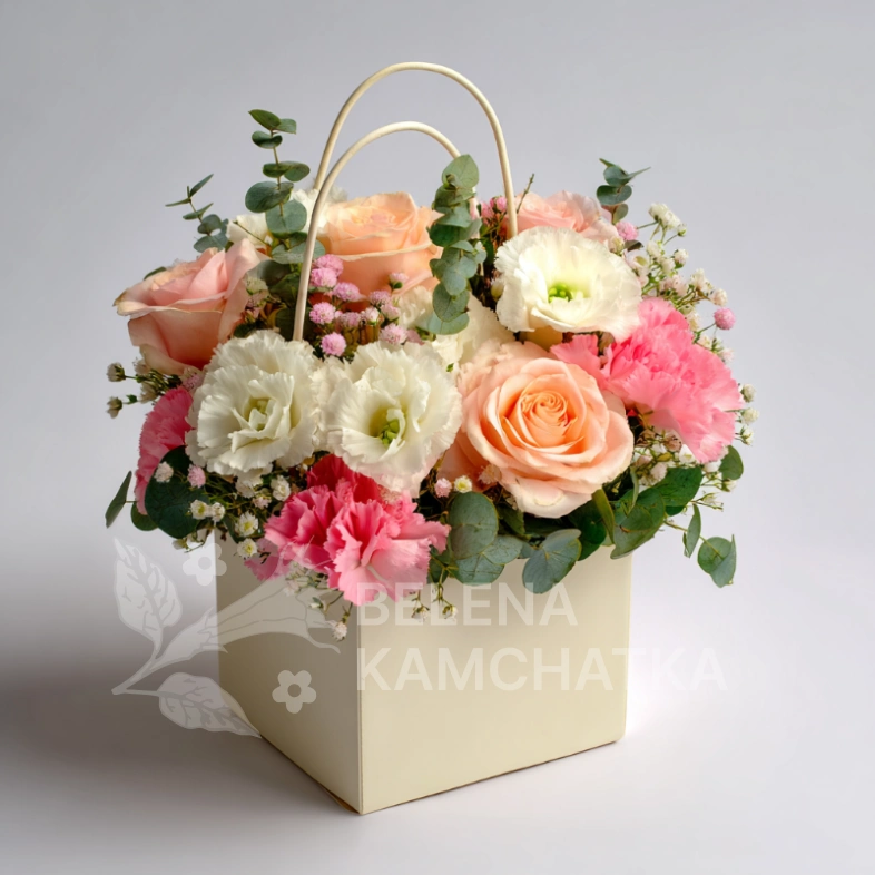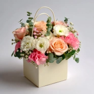 ГлавнаяКаталогКомпозицииВ сумочкахЦветы в сумочке «Миниатюрное вдохновение»