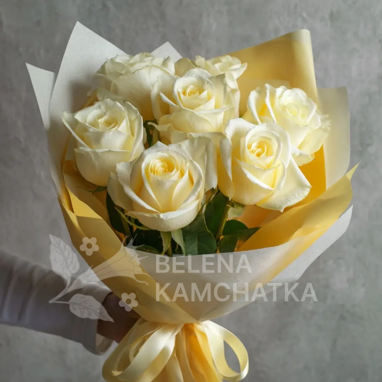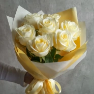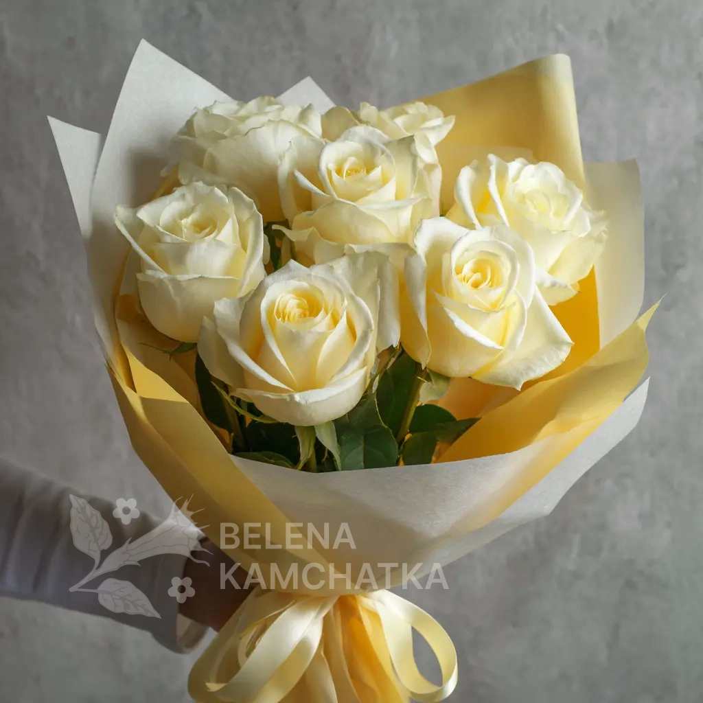 Роскошный букет, в котором белые розы сияют как благородное золото. Подойдёт для важных событий, деловых поздравлений или элегантного подарка. Совмещает утонченность и статусность.